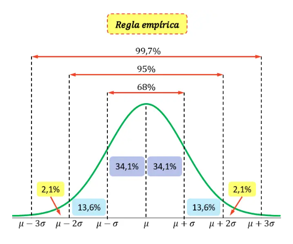 - El 68% de los valores de una distribución normal se encuentran a una desviación estándar de la media.