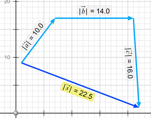 Para la suma se ubican la cola del segundo con la cabeza del primero conservando el mismo valor, dirección y sentido y luego la cola del tercero con la cabeza del primero conservando sus características.Si hay más vectores se continúa el mismo proceso. La suma S= a+b+c, es el vector resultande que parte de la cola del primer vector con la cabeza del último.