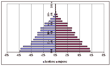 Este tipo de gráficos se utilizan con frecuencia para volcar resultados de censos poblacionales o estudios similares. En el ejemplo presentado, se distribuyen los valores en dos categorías (hombres y mujeres) a lo largo de los valores de edad, expresando la tendencia a través de las barras que conforman la pirámide.