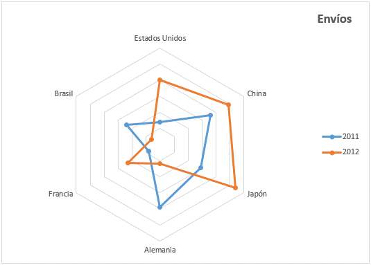Este tipo de gráficos pueden utilizarse, por ejemplo, para graficar el número de envíos de productos durante distintos años (2011 y 2012 en el ejemplo) hacia otros países (en Francia, Brasil, Estados Unidos, China, Japón y Alemania, en el ejemplo).